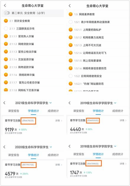 截止目前,“生命育心大学堂”章节学习次数累计已达252330次,平均每位同学学习205次。目前课程已发布397个任务,根据需要课程章节仍在持续新增中。
