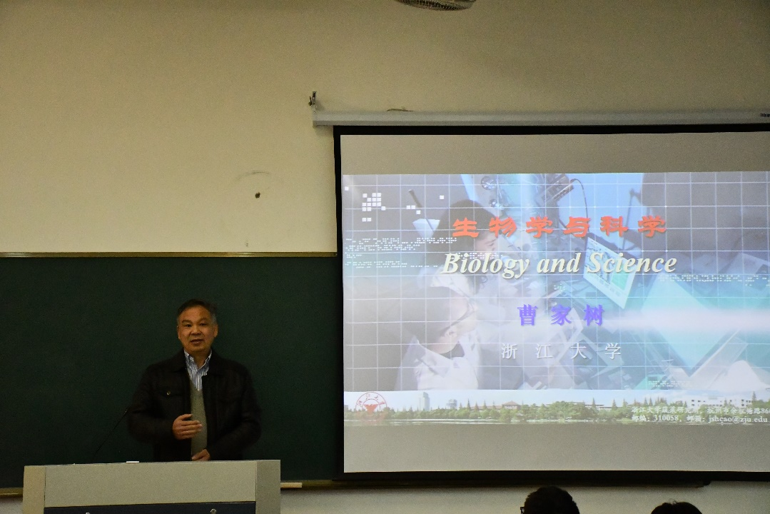 11月25日下午,生物科学专业《生命科学前沿》第四讲在4-401教室进行,浙江大学教授曹家树做题为《科学与生物学》的专题讲座。