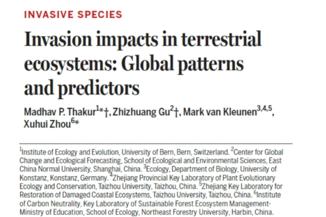 近日,我校高等研究院全球变化与进化生态学研究所Mark van Kleunen教授作为重要共同作者,在国际顶级学术期刊《Science》上发表了题为“Invasion impacts in terrestrial ecosystems: Global patterns and predictors”(陆地生态系统中的入侵影响:全球格局与预测因子)的研究论文。 该研究由瑞士伯尔尼大学Madhav P. Thakur团队、华东师范大学顾志壮团队、我校高等研究院Mark van Kleunen、东北林业大学周旭辉团队等全球多个顶尖科研机构合作完成,台州学院全省受损生态系统修复重点实验室、台州学院浙江省植物进化生态学与保护重点实验室为该论文的共同署名单位。