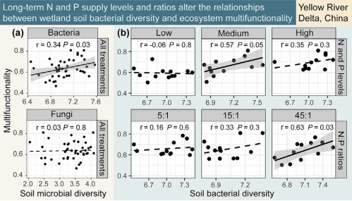 Human activities have changed the levels and ratios of nitrogen (N) and phosphorus (P) in wetland ecosystems. However, the effects of N and P levels and ratios on wetland soil microbial community and ecosystem multifunctionality remain unclear, especially on the relationships between soil microbial diversity and ecosystem multifunctionality. In this study, the effects of a 7-year experimental nutrient addition on the soil microbial community and ecosystem multifunctionality (12 function variables related to carbon, N, and P cycling) were assessed by combining three N and P supply levels with three N:P supply ratios in a coastal nontidal wetland ecosystem. According to the obtained results, the N and P supply levels significantly affected soil bacterial community composition, as well as ecosystem multifunctionality, while no significant effects of N:P supply ratios were observed. Although N and P supply levels did not significantly affect bacterial and fungal diversity, they both changed the complexity of bacterial and fungal networks. Soil ecosystem multifunctionality was significantly and positively correlated with bacterial diversity rather than fungal diversity. Moreover, the correlation coefficient between bacterial diversity and ecosystem multifunctionality showed an increasing-decreasing trend with increasing N and P supply levels and an increasing trend with increasing N:P supply ratios. However, the correlation coefficient between bacterial diversity and ecosystem multifunctionality was not significantly correlated with bacterial network complexity. The current study provides new insights into the impacts of N and P levels and ratios on soil microbial community and ecosystem multifunctionality in a coastal nontidal wetland. In particular, the present study highlighted that changes in N and P supply levels and ratios lead to changes in the relationship between soil bacterial diversity and ecosystem multifunctionality, which should be considered in related studies to accurately predict the responses of ecosystem multifunctionality to N and P inputs in coastal nontidal wetlands.