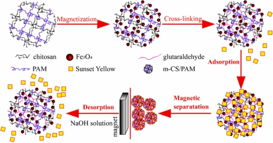 The water solubility in acid solution, relative low adsorption capacities and unsatisfactory separation performance limit application of traditional chitosan-based adsorbents in wastewater treatment. To break the limitation, a hydrophilic magnetic Fe3O4 embedded chitosan–crosslinked-polyacrylamide composites (abbreviated as m–CS–c–PAM) were prepared by a two–step method. The m–CS–c–PAM composites were systematically characterized using SEM, XRD, FTIR, VSM, TGA and BET. Sunset yellow (SY) was selected as model food dye to
