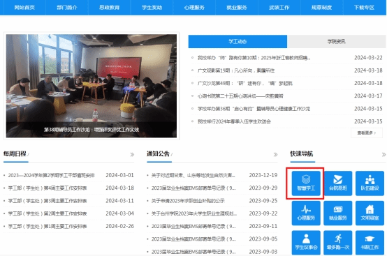 1.进入“台州学院学工部”首页(https://xsc.tzc.edu.cn/),在“快速导航”栏点击“智慧学工”。