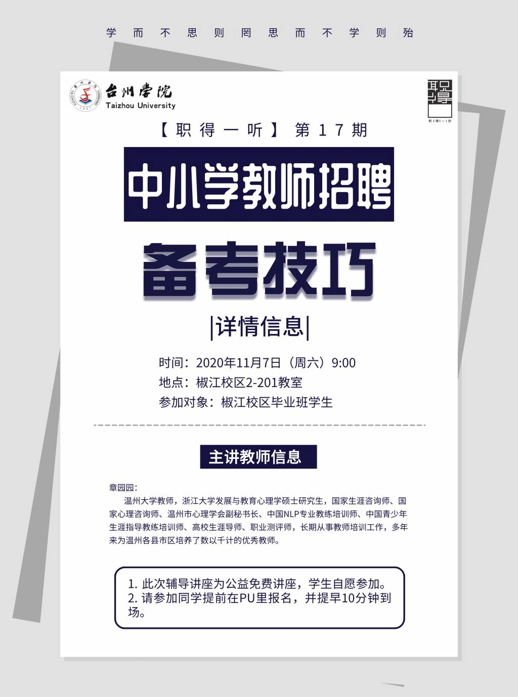 为进一步助力同学考取教师编制,校学生处(就业服务中心)特邀请温州市教师编制考试辅导专家、温州大学教师章园园老师来校,举办中小学教师招聘备考技巧攻略。具体安排如下: