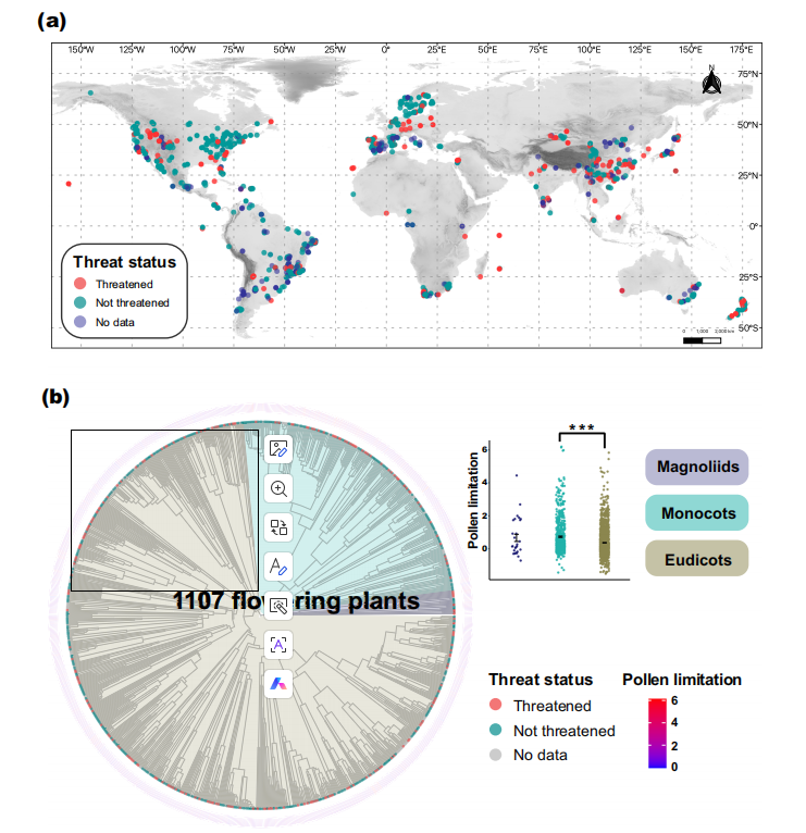 Most flowering plant species rely on animal pollinators to reproduce, but insufficient pollen receipt, or pollen limitation, commonly occurs and is mediated by plant traits. Pollen limitation could either exacerbate extinction threat or arise as a consequence of population and range declines in threa tened plants, leading to the expectation that pollen limitation should be higher in threatened compared to non-threatened plants. To test this, we perform a meta-analysis on a global dataset of pollen limitation from 2633 pollen sup plementation experiments, integrating plant threat status and thirteen reproduction and life history traits. Threatened plant species have 26% higher levels of pollen limitation than non-threatened species. This pattern is mod erated by plant traits and geographic location: we find higher levels of pollen limitation for threatened compared to non-threatened species for pollinator dependent plants and for plants found in Asia and temperate zones. Using path analysis, we find that plant traits, study region, and threat status are causally linked to pollen limitation. We suggest that plant traits such as auto fertility, which strongly predict pollen limitation, should be considered in global databases on plant threat. Further, preventing pollen limitation through habitat and pollinator management is a promising path to preventing plant extinction.