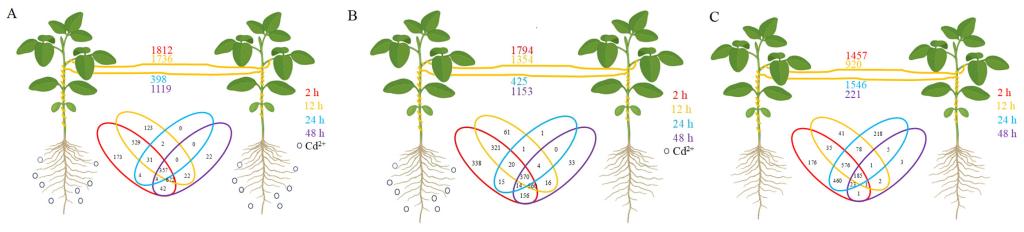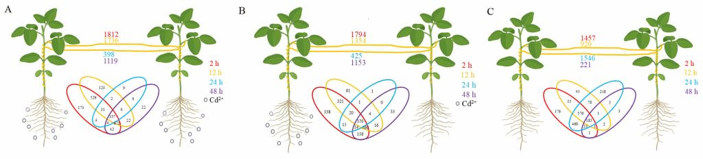 Conclusion: Cd2+ treatment could directly and indirectly induce transcriptomic changes in the donor plant and neighboring recipient plant connected by dodder bridge. These results contribute to a better understanding of how plants connected by dodder bridges respond to environmental stresses.