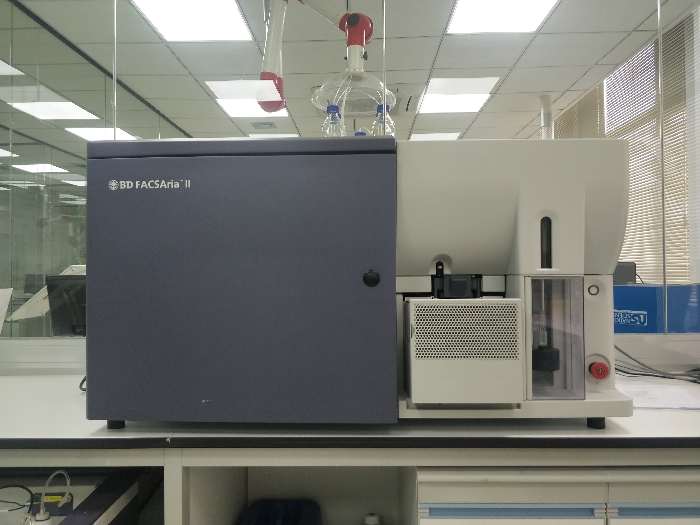5. 时间参数:可与任意参数结合, 做动态检测参数:BD FACSAriaⅡ流式细胞分选仪配置405nm,488nm,640nm三根不同波长的激光器,可同时检测9种荧光素,11个参数,适用于细胞形态结构及GFP/FITC、PE/PI、PerCP、APC-CY7、APC等荧光标记细胞的检测和无菌分选。