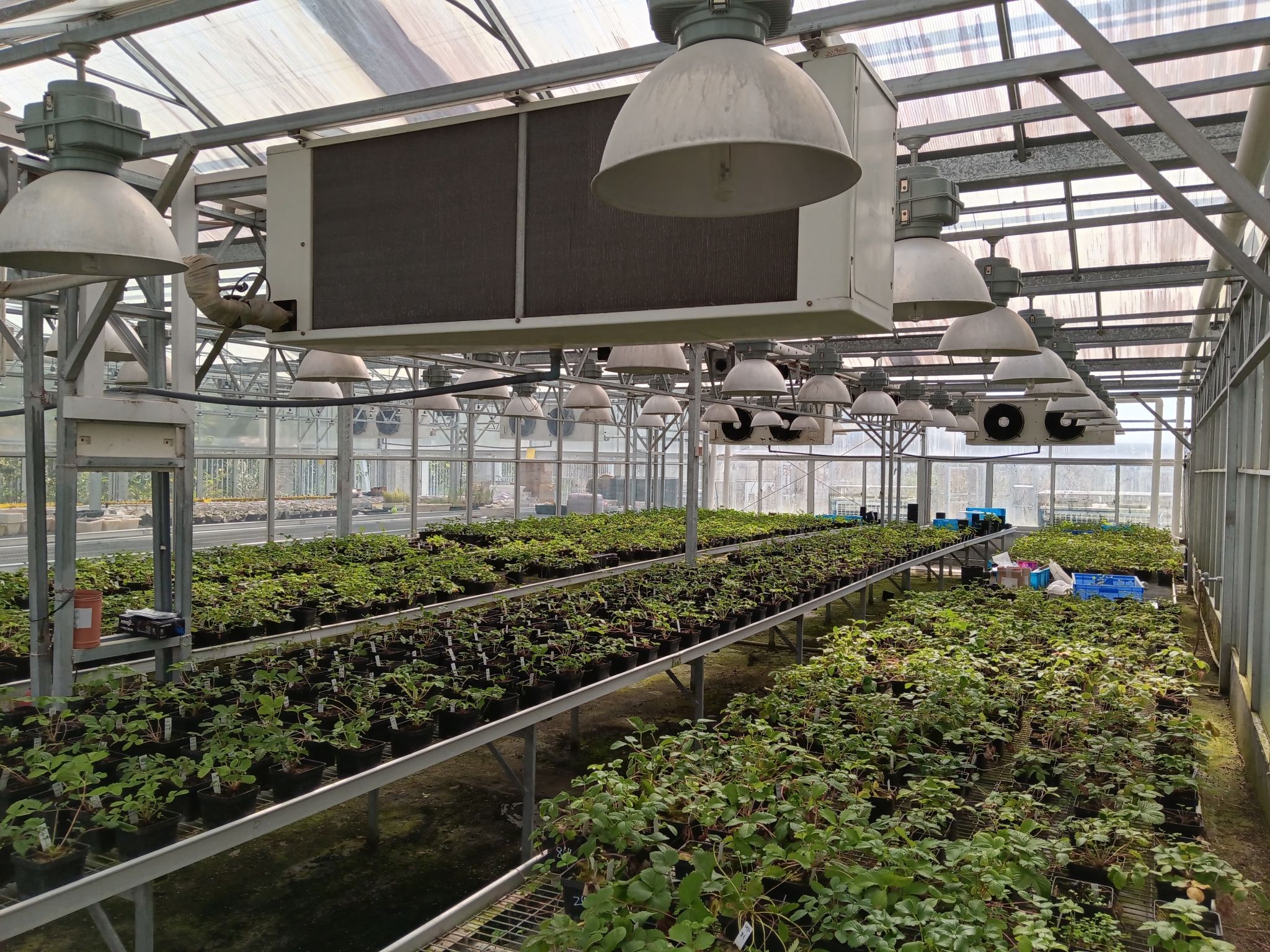 全控温阳光房坐落在椒江校区西南角,面积为768平方米,按照温室主体结构标准设计建造,阳光房整体外墙采用PC阳光板,温度控制、人工自动补光按照气候室专业要求来设计建造,并考虑照明、通风换气等附属功能;同时根据实验种植植物对温度、自然光照的要求,规划采用温室阳光房结合制冷机组精确降温相结合的的结构。整个阳光气候室,结构合理,温度控制稳定,同时具备常年运行的节能模式。阳光房由5间独立的温室组成,每间温室面积从140-160平方米不等,每间温室可独立控制温度等参数,并建有4列可移动的苗床。