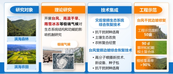 针对极端气候干扰对滨海生态系统结构和功能的影响机制不清、修复技术不足等问题,阐明台风、高温干旱和极端高温、雨雪冰冻对滨海森林、农田生态系统结构和功能的影响机制,选育抗干扰树种,集成土壤生态改良、农林复合经营等灾后受损生态系统恢复技术体系。尤其是针对山区抗台风受损边坡治理和修复,开发高分子喷播新材料新工艺,研制配套喷播设备和喷播种子包产品,集成抗台风干扰森林生态系统修复技术体系,建立工程示范并推广。